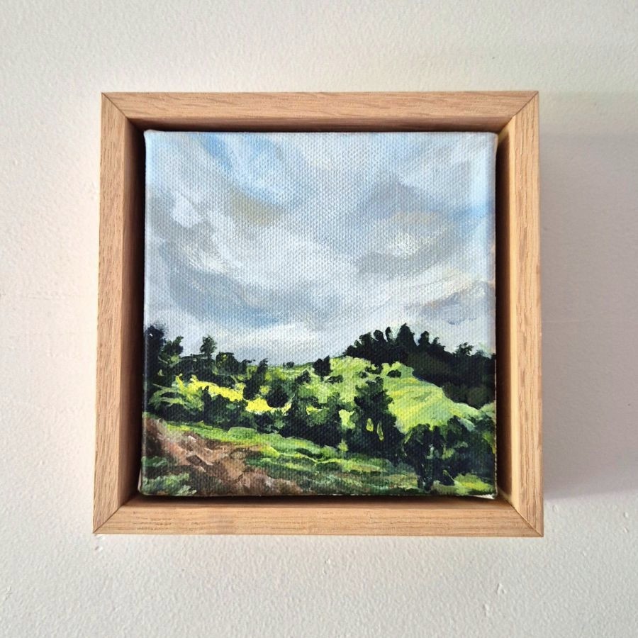 What may seem as the simple” landscapes like this are often my favourite. They hold a sweet memory of place and time that tells a story you want to hold on to. Like a photograph but better! It captures the light on the hill and the way the sky was moving at the time. A capture of time. Yes. Time standing still.